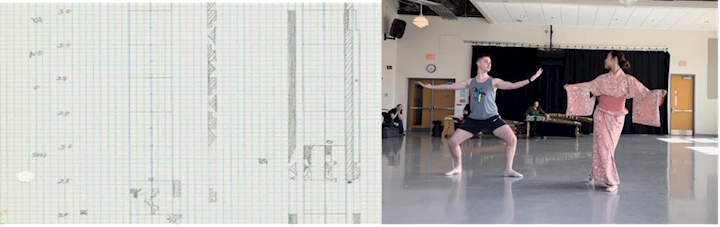 After fieldwork, I returned to the Dance Notation Bureau and proceeded to embody and restage the excerpt from one of her works, “Chidori,” a duet featuring a female and male dancer that depicts a love story between a fisherman and a bird (Chidori). Labanotation scores, which are similar to music scores, record choreography using a complex system of characters and shapes. To decipher a five minute segment of the score (25 pages of Labanotation), I met weekly for three months with my duet partner, Forrest Hershy, and Labanotation notator Dr. Valarie Williams.