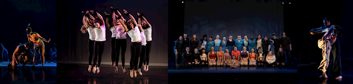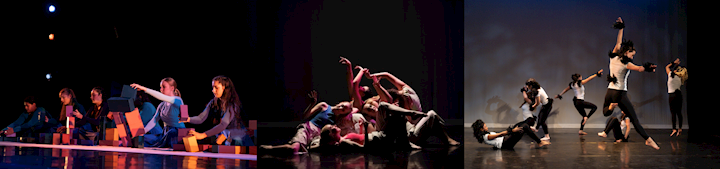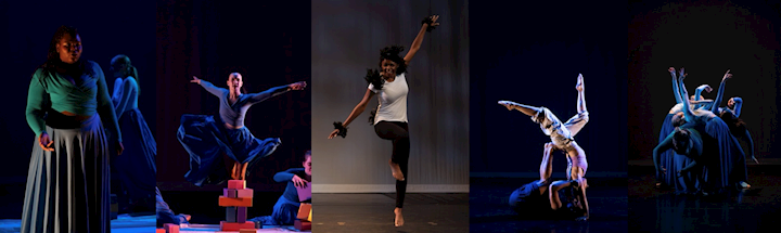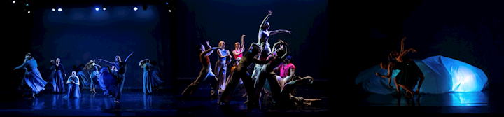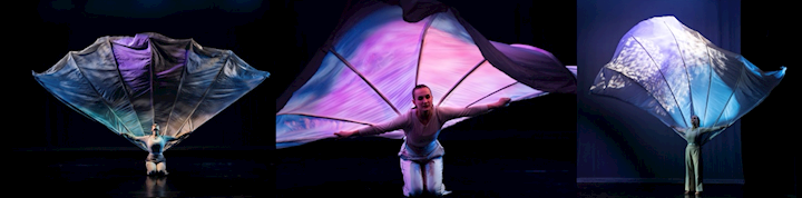 I would also like to acknowledge my collaborators, Melissa Owens (costume designer) and Ashley Pittman (lighting designer). These images are my favorite examples of how these collaborations elevate my work. I wanted to make a manta ray, so Melissa bought a white gym parachute and some PVC pipe to create this prop while Ashley used gobos and LED movers to create a pulsing, textured light that helped this dancer appear underwater. I’m grateful for the layered craftsmanship they brought to our production.