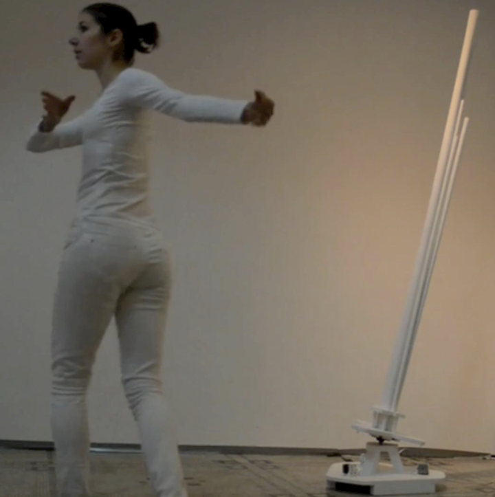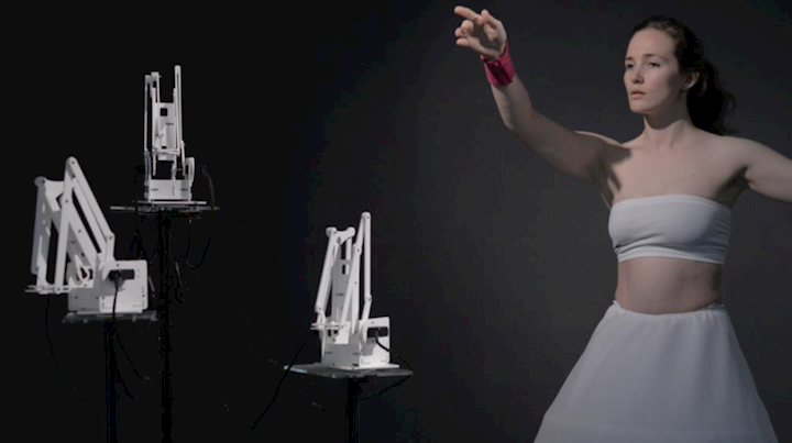 The first piece created for this series, ‘Dancers in White, Standing’ (2017) brings three robotic dancers together on stage with a human dancer. Constructed of plastic and metal, the robotic dancers have a physical structure and movement capabilities similar to that of an industrial robotic arm. All of the dancers, both human and non-human, follow the same improvisational score. They also all listen and respond to the music and most importantly they watch each other. The non-human dancers respond to the movements of the human dancer while in turn the human dancer responds to the movements of the non-human. A choreographic feedback loop.
